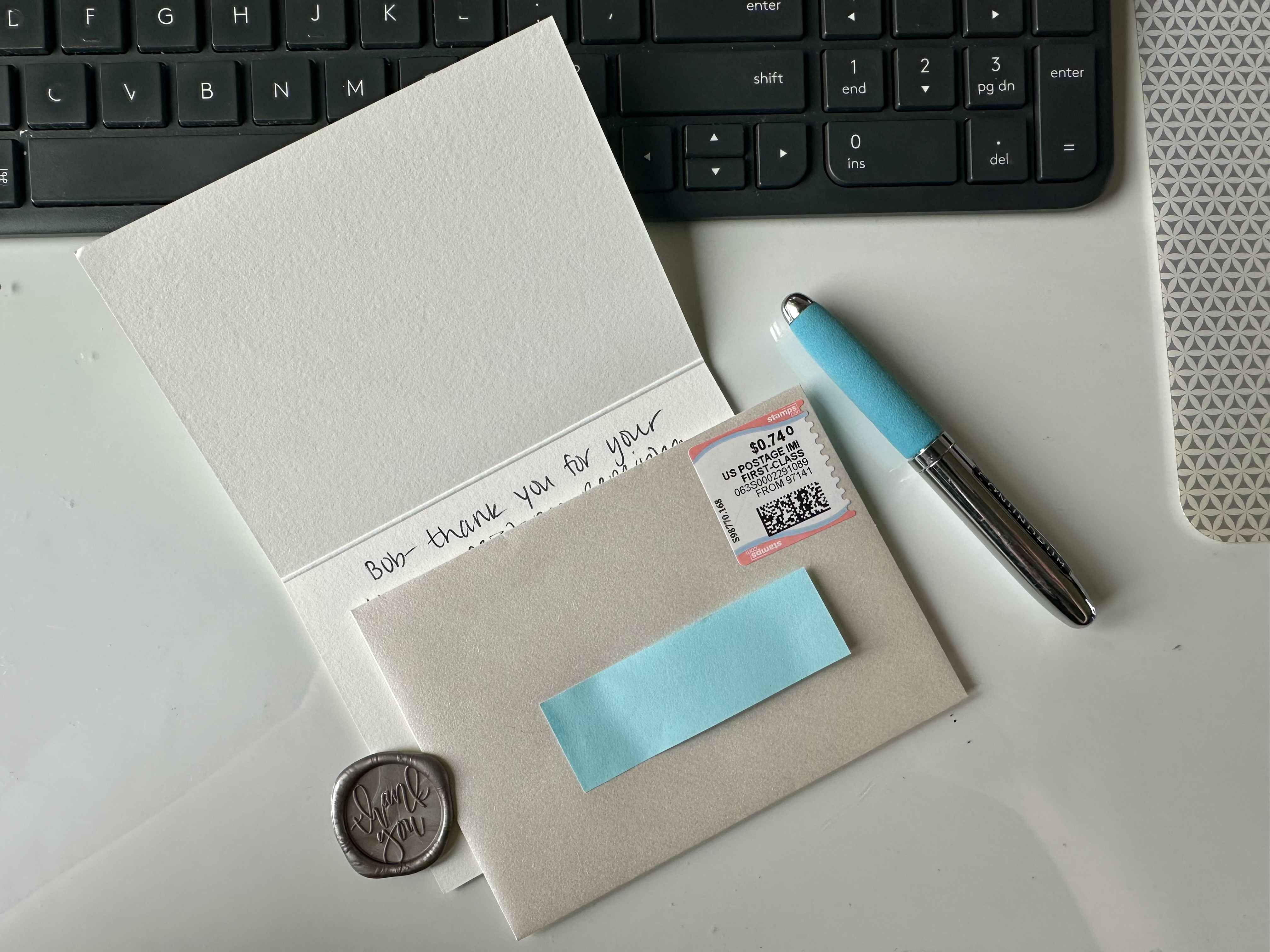 Stationery sends start at $6.50 per card — includes a neatly handwritten message and first-class US postage. Choose from our simple, modern stock (some examples shown above) or dropship your own stationery directly to us.